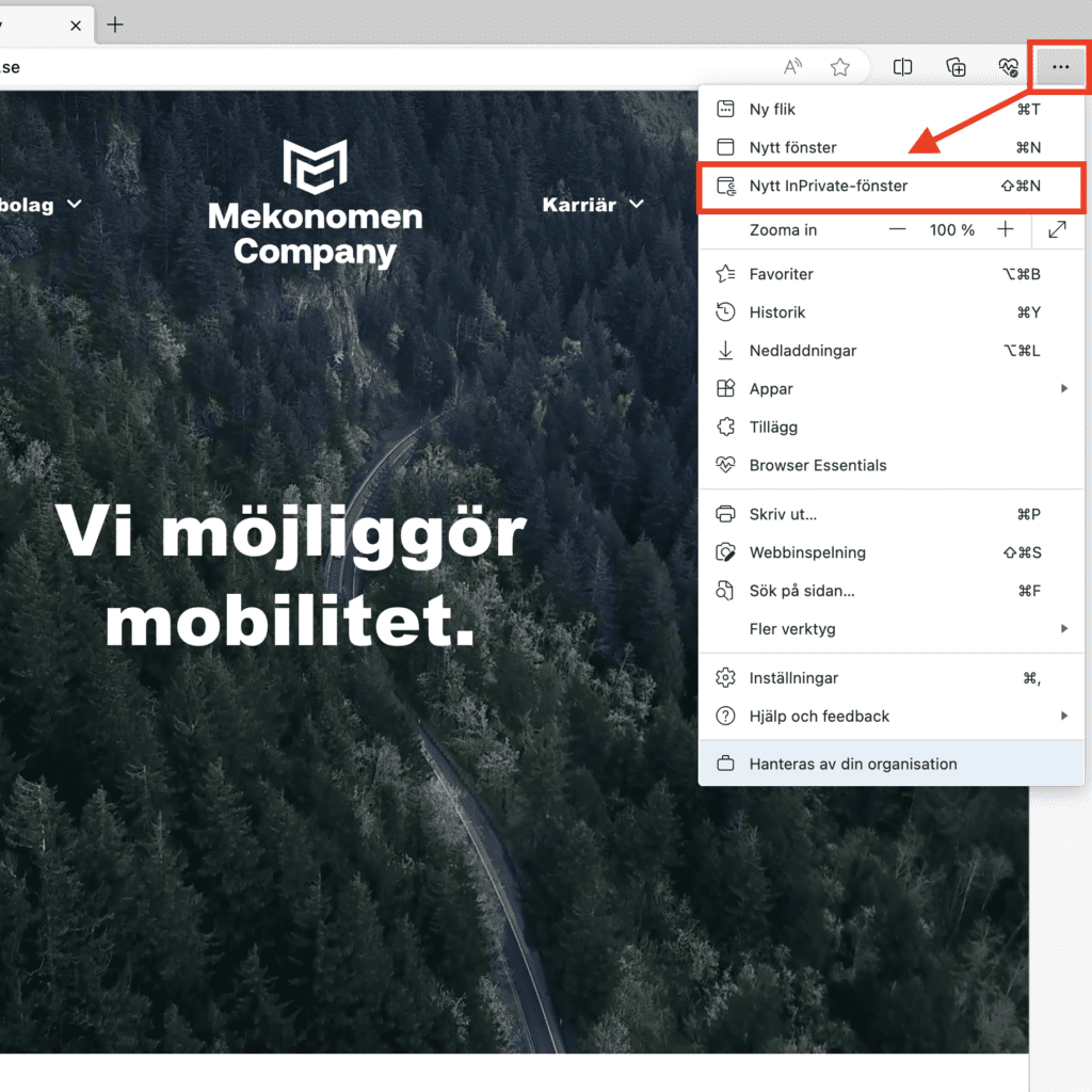 - Logga in på MECA Bilservice Extranät via ett InPrivate-fönster (bild visar förfarande i Microsoft Edge):